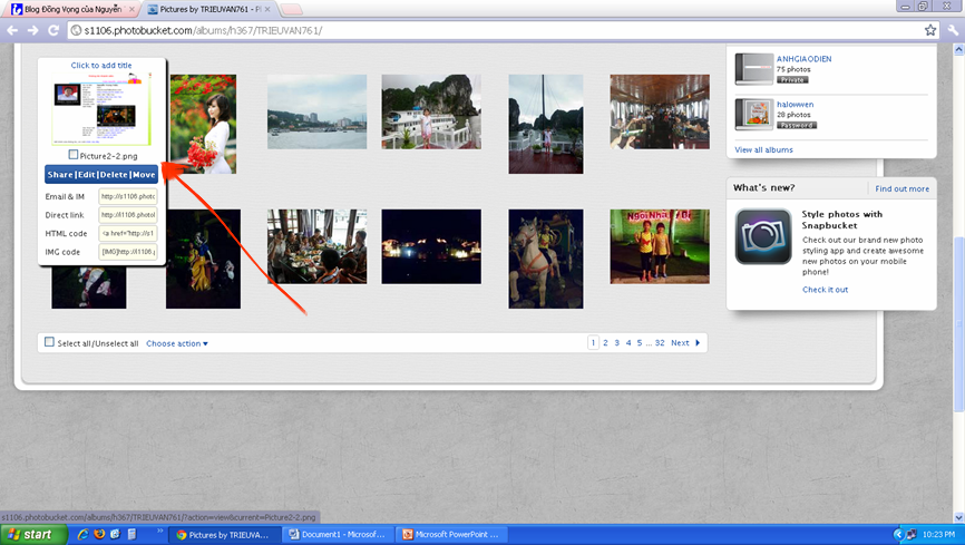Thầy cô hãy đưa ảnh cần chèn vào bài viết lên và mở song song 2 trang web như hình trên. ( Blog cá nhân trên violet và trang lưu giữ ảnh photobuket )